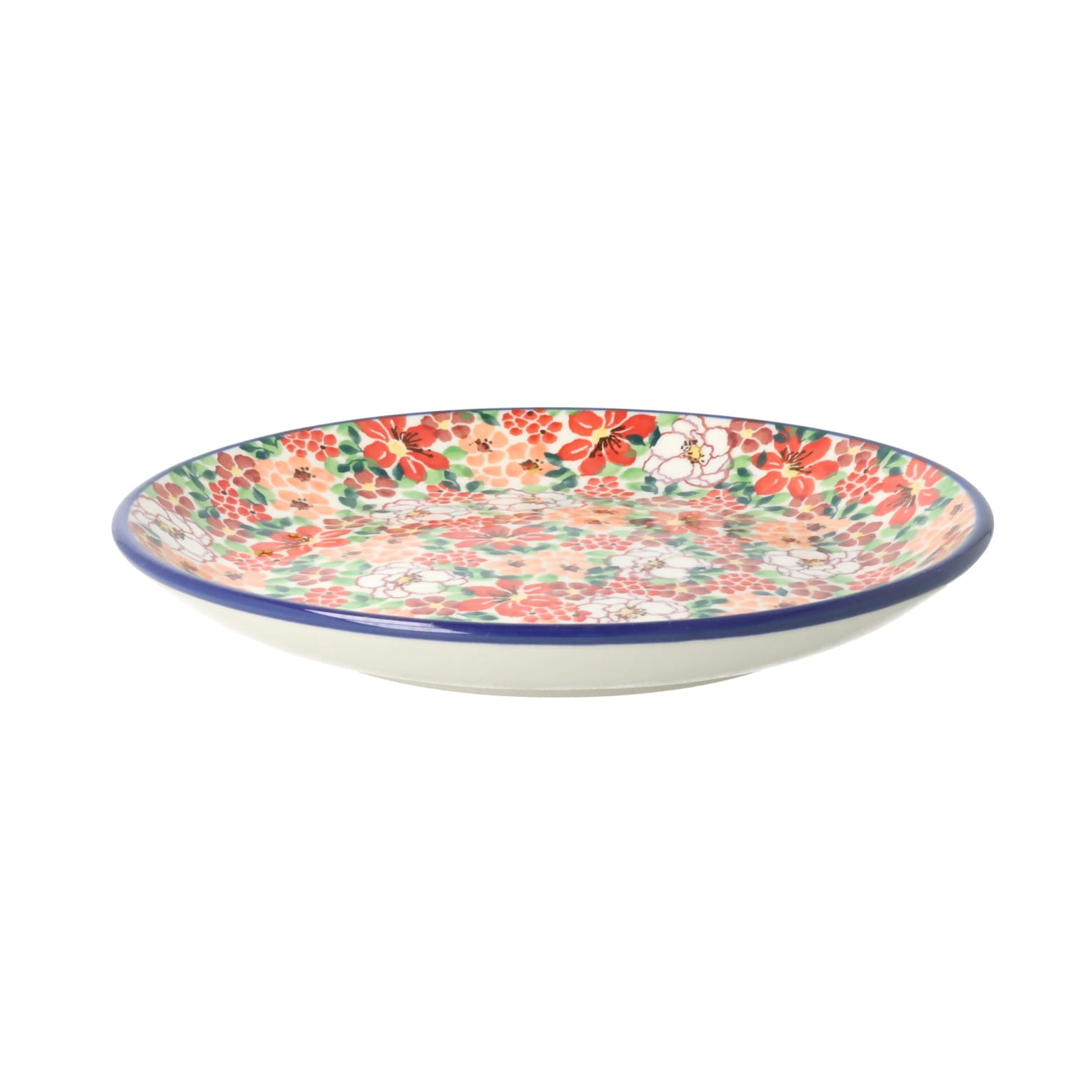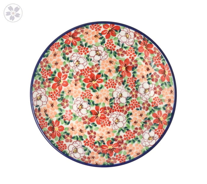 Płaski talerz deserowy. Produkt ręcznie formowany i dekorowany w Ceramice Artystycznej S.R.A. Bolesławiec.
