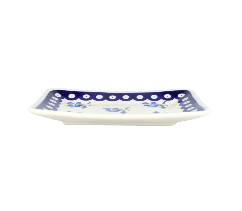 Kwadratowy talerz deserowy z falbanką. Produkt ręcznie formowany i dekorowany w Zakładach Ceramicznych Bolesławiec.