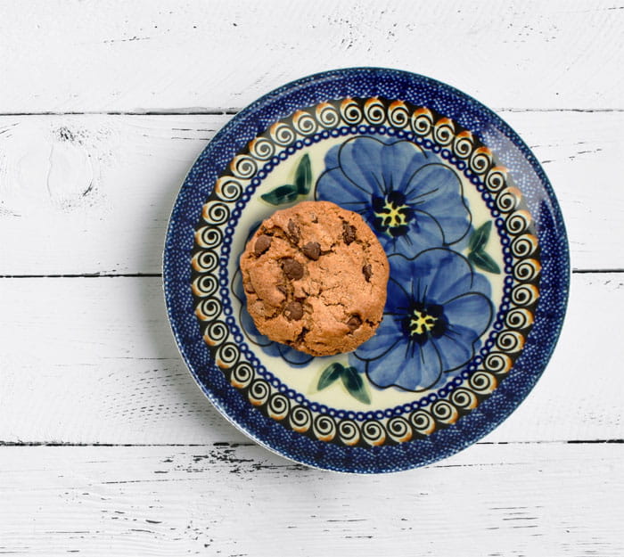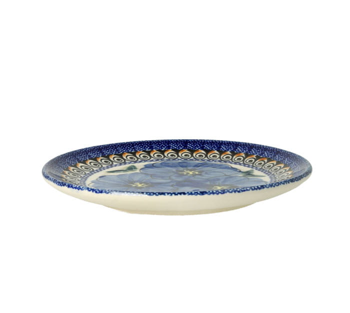 Płaski talerzyk deserowy. Produkt ręcznie formowany i dekorowany w Zakładach Ceramicznych Bolesławiec.