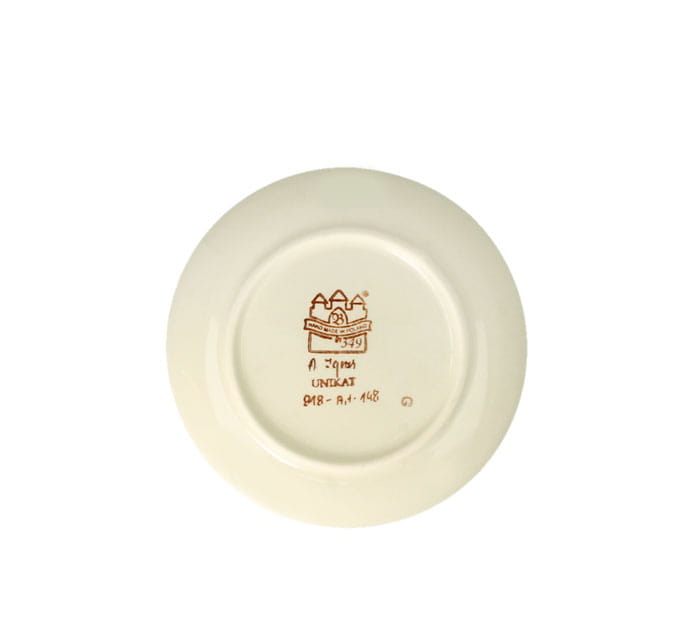 Mały, płaski talerz deserowy. Produkt ręcznie formowany i dekorowany w Zakładach Ceramicznych Bolesławiec.