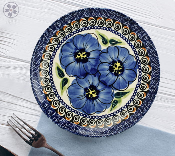 Płaski talerz śniadaniowy. Produkt ręcznie formowany i dekorowany w Manufakturze Galia Bolesławiec.