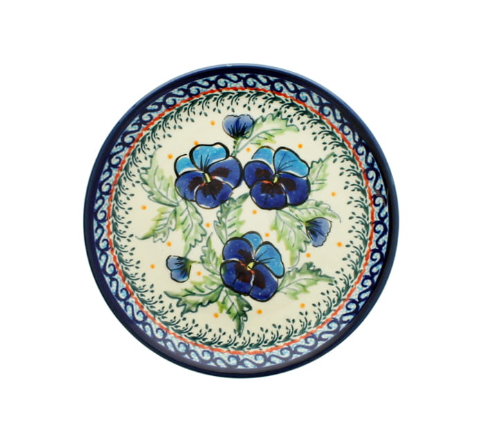 Mały, płaski talerz deserowy. Produkt ręcznie formowany i dekorowany w Zakładach Ceramicznych Bolesławiec.