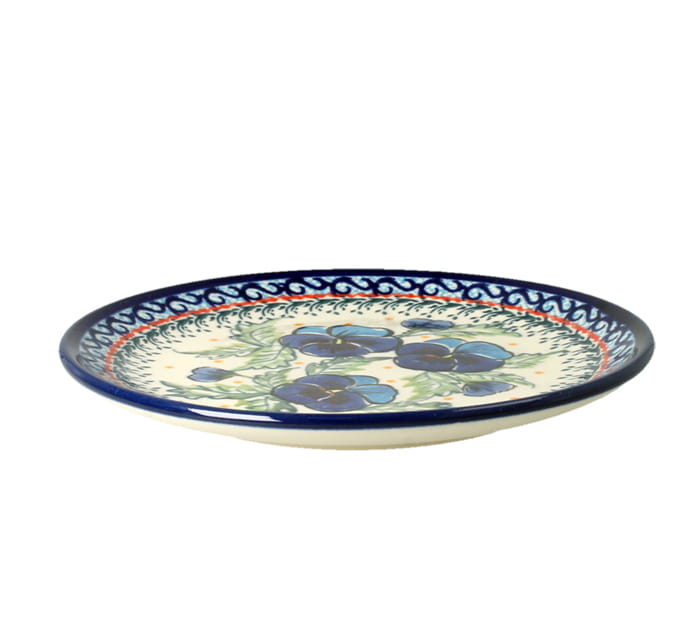 Płaski talerzyk deserowy. Produkt ręcznie formowany i dekorowany w Zakładach Ceramicznych Bolesławiec.