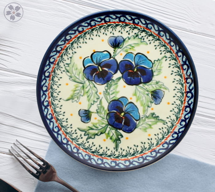 Płaski talerz śniadaniowy. Produkt ręcznie formowany i dekorowany w Zakładach Ceramicznych Bolesławiec.
