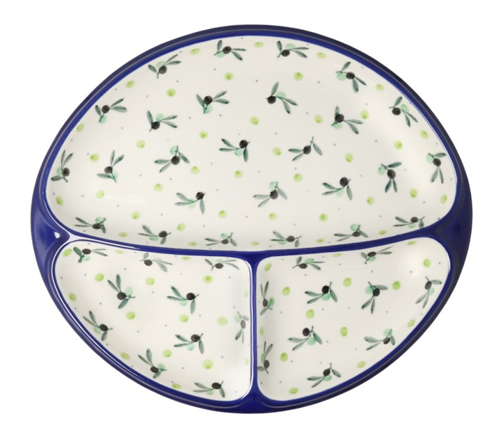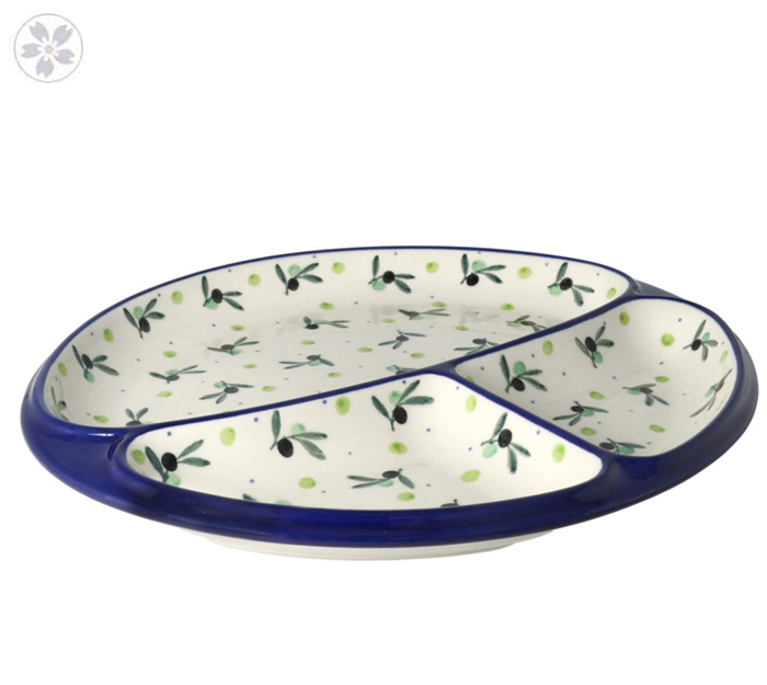Talerz dzielony do serwowania dań i przekąsek. Dzięki oddzielnym wgłębieniom możemy zaserwować 3 rodzaje orzechów, suszonych lub świeżych owoców itd. Świetnie sprawdzi się do trzyskładnikowych dań.