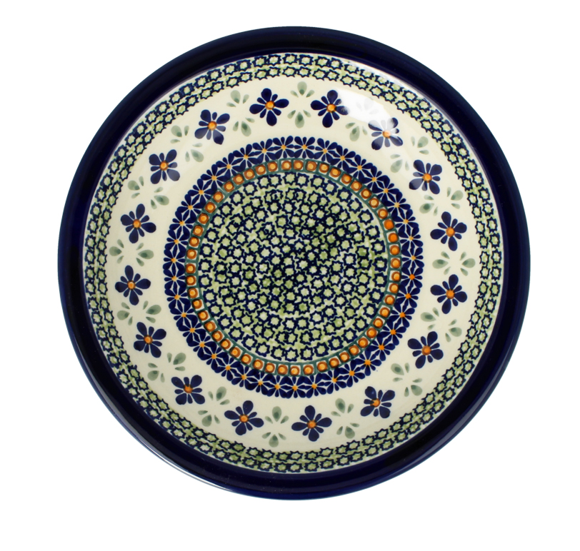 Duża, okrągła taca z otworem na chochlę. Produkt ręcznie formowany i dekorowany w Zakładach Ceramicznych Bolesławiec.
