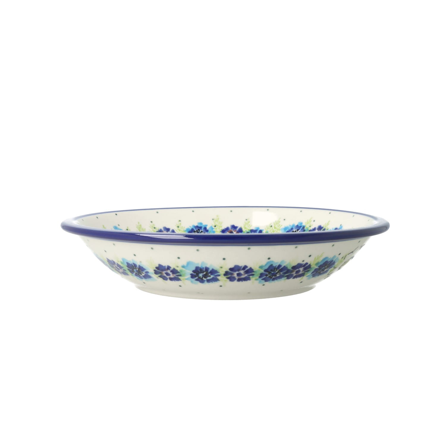 Płaski talerz deserowy. Produkt ręcznie formowany i dekorowany w Ceramice Artystycznej S.R.A. Bolesławiec.