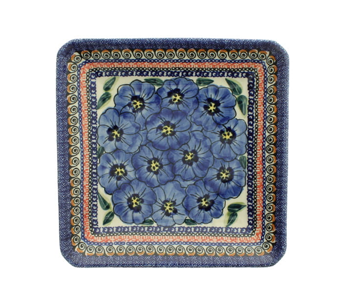 Kwadratowy talerz deserowy z falbanką. Produkt ręcznie formowany i dekorowany w Zakładach Ceramicznych Bolesławiec.