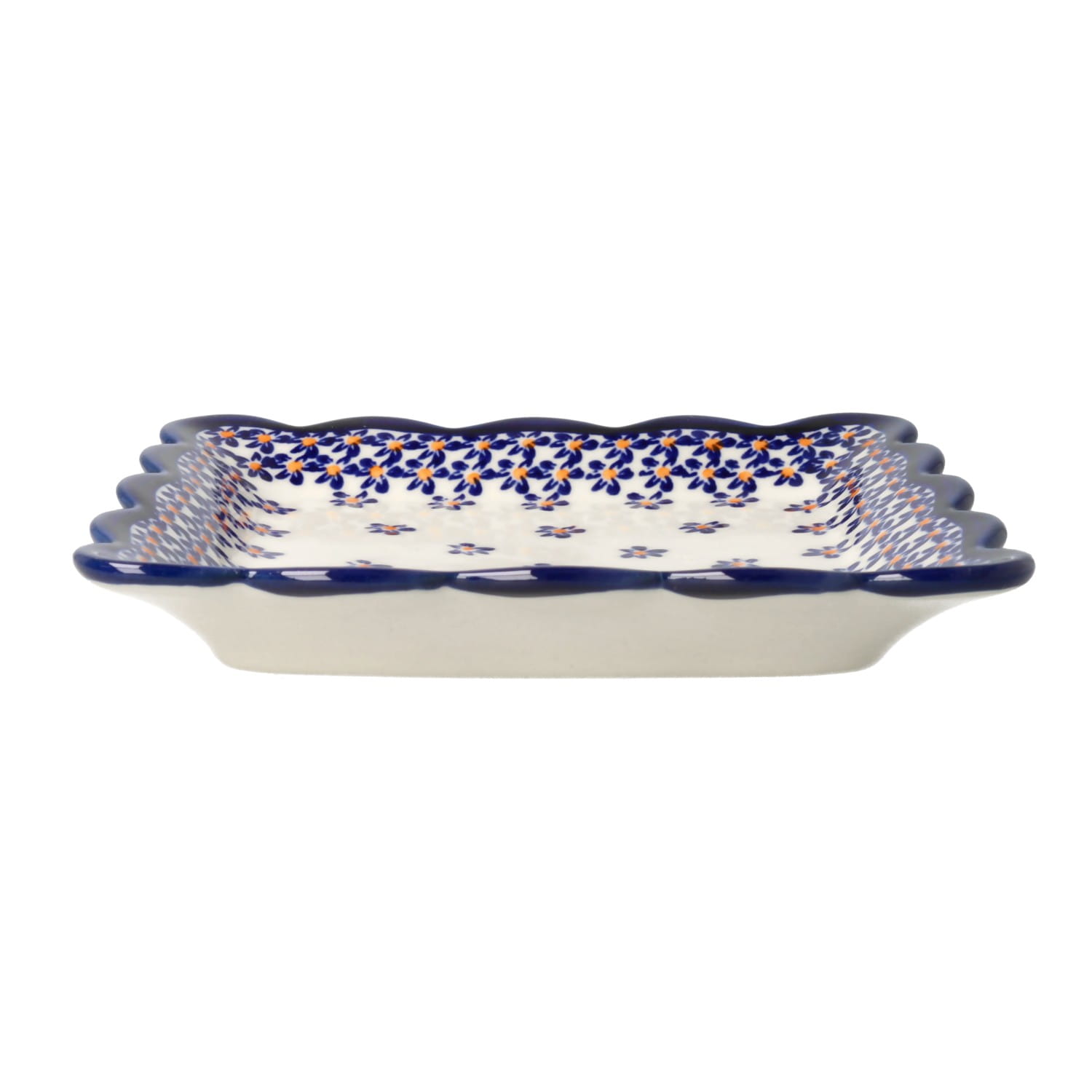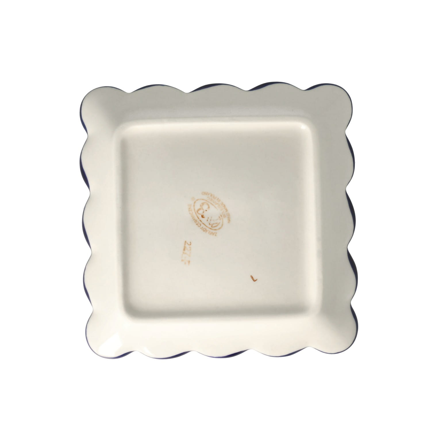 Kwadratowy talerz z falistym brzegiem.