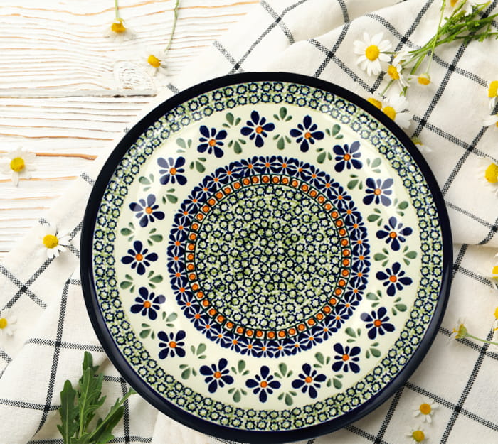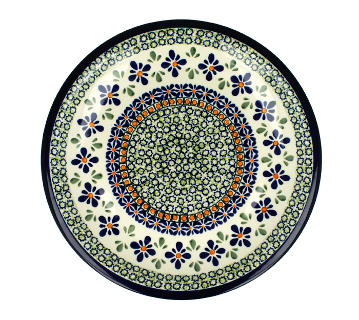 Duży, płaski talerz obiadowy. Produkt ręcznie formowany i dekorowany w Zakładach Ceramicznych Bolesławiec.