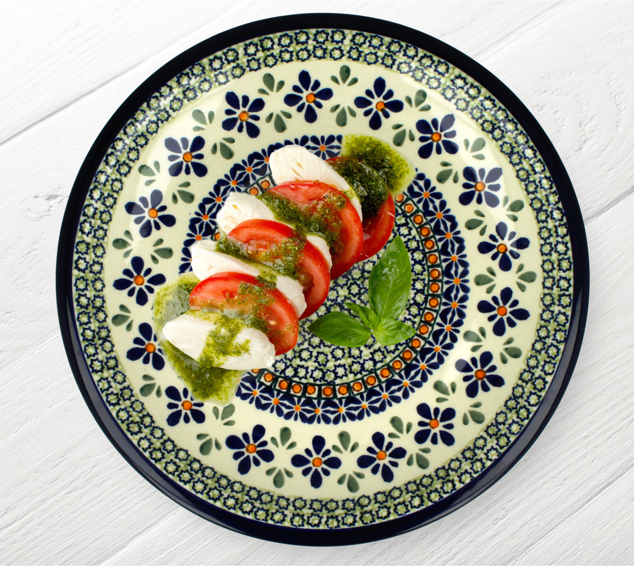 Naczynia w tym wzorze dekorowane są ręcznie, za pomocą stempli i pędzla.