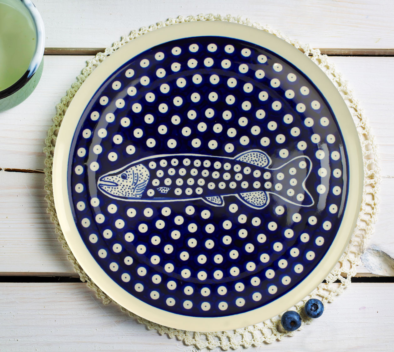 Duży, okrągły talerz-taca. Produkt ręcznie formowany i dekorowany w Zakładach Ceramicznych Bolesławiec.