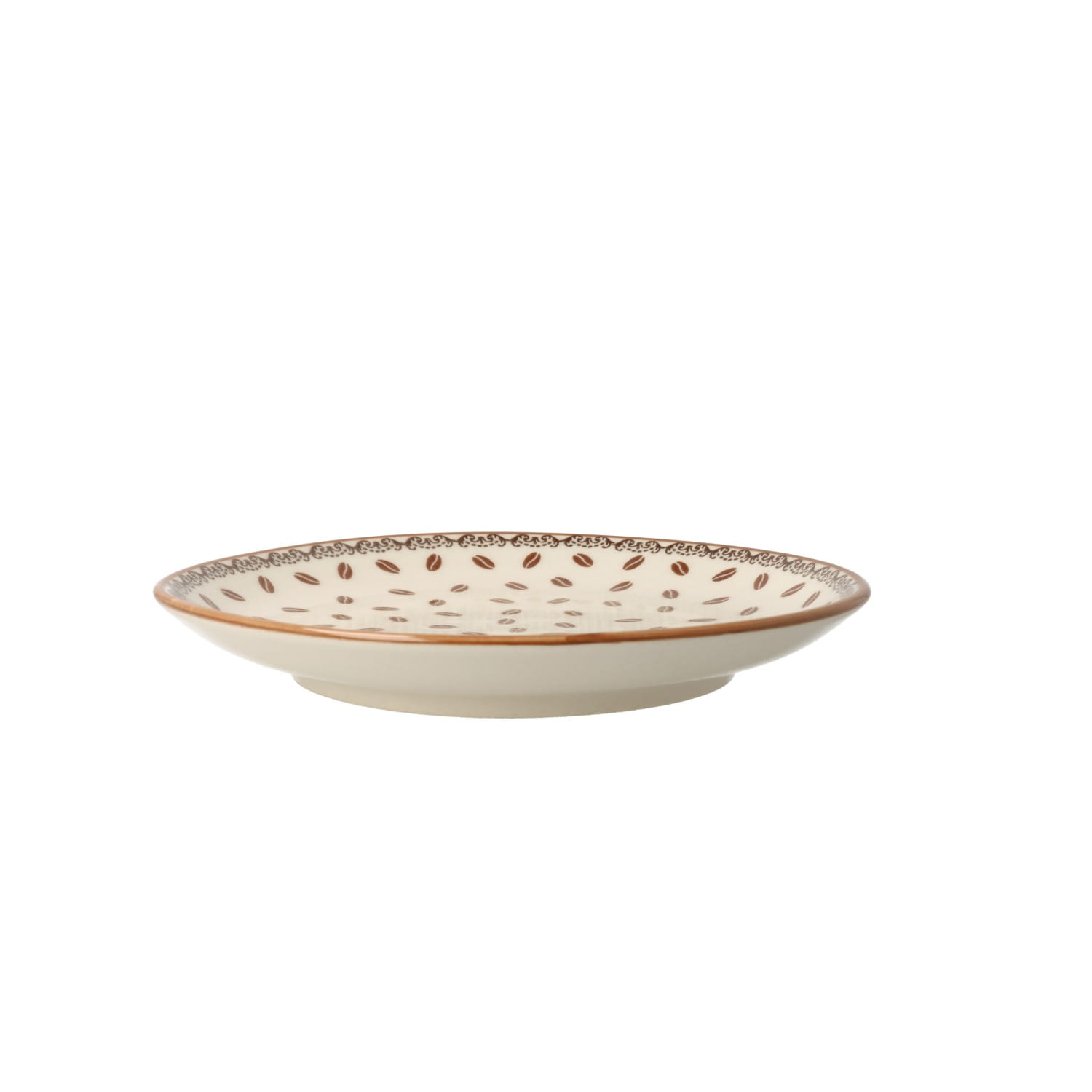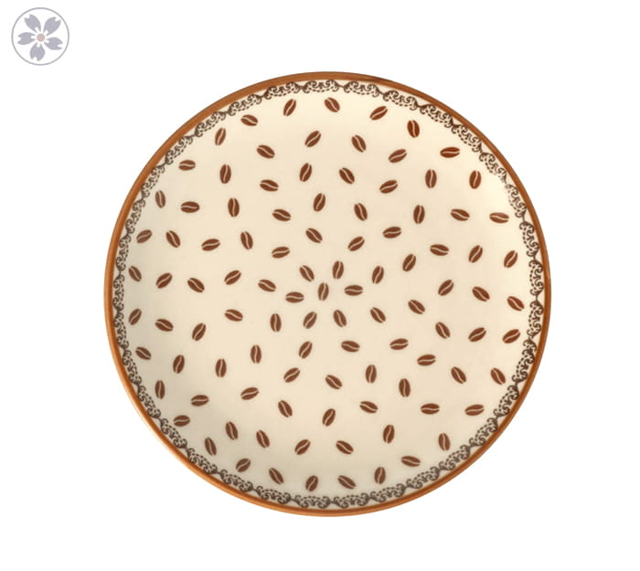 Klasyczny talerz śniadaniowy, idealny do podawania ciast i przekąsek. Wzór w ziarenka kawy wprowadzi do jadalni ciepłą atmosferę.