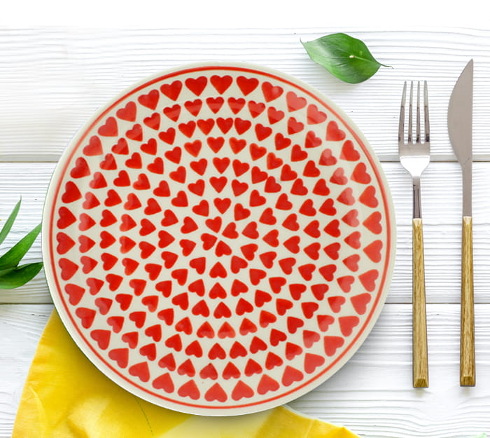 Płaski talerz obiadowy w serduszka. Produkt ręcznie formowany i dekorowany w Manufakturze Galia Bolesławiec.