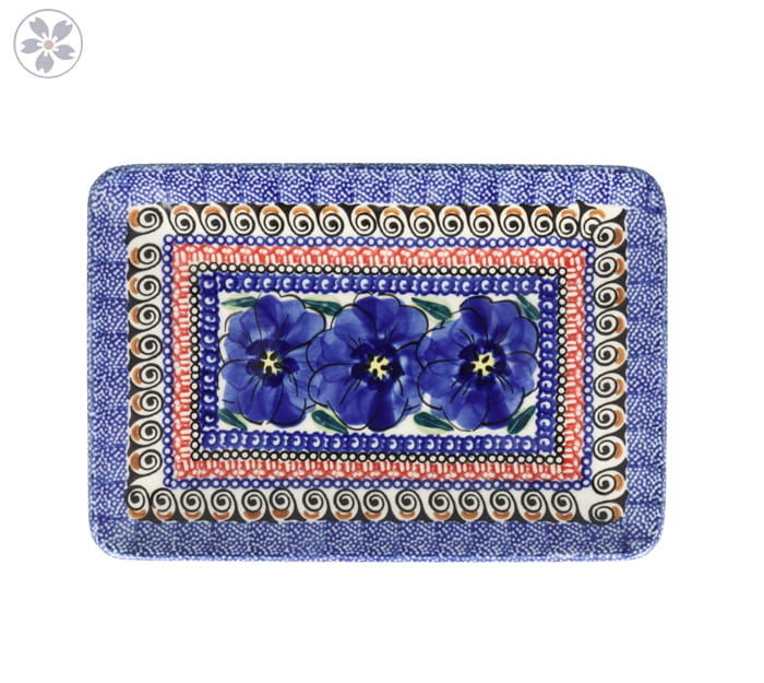 Podłużna taca z podniesionym brzegiem. Produkt ręcznie formowany i dekorowany w Zakładach Ceramicznych Bolesławiec.