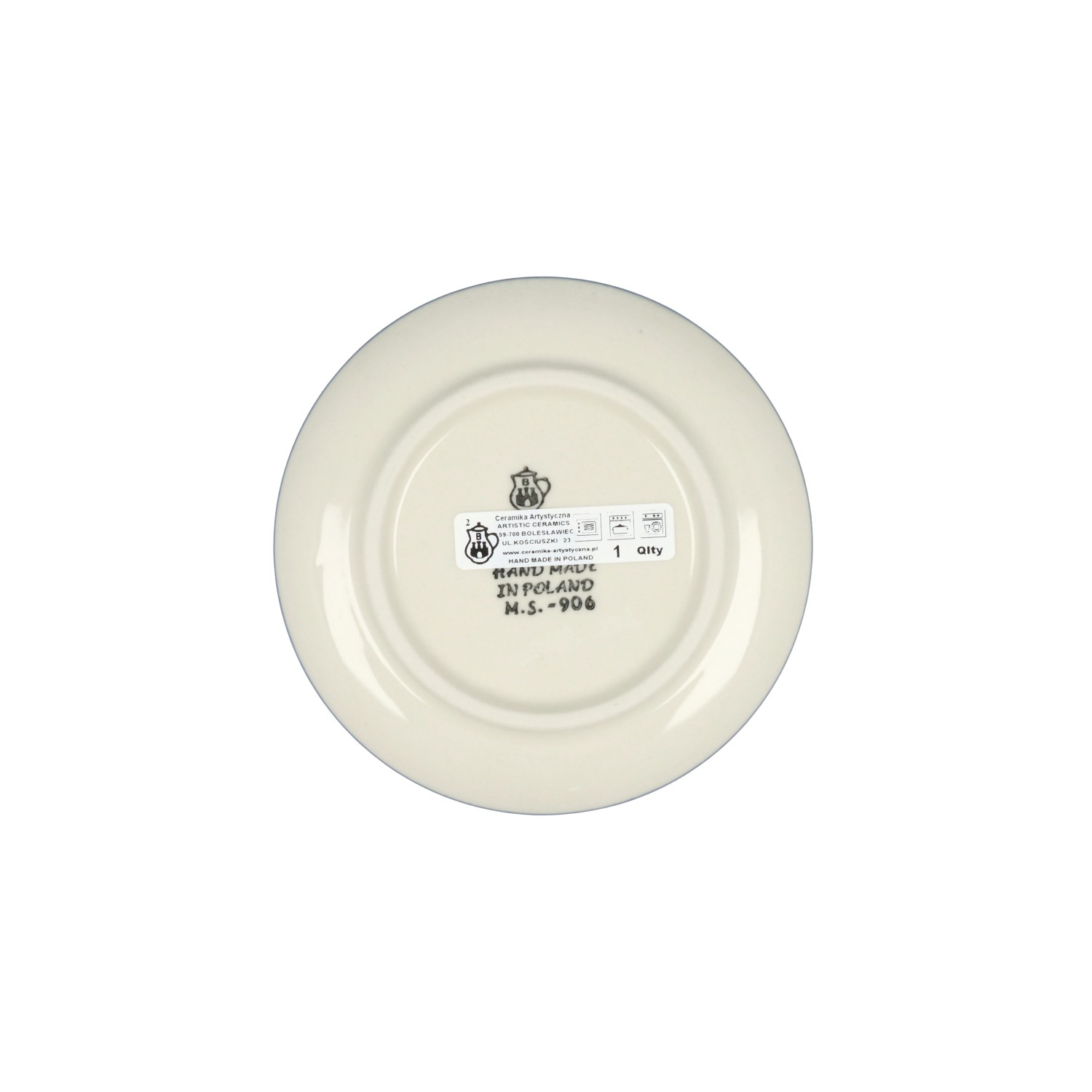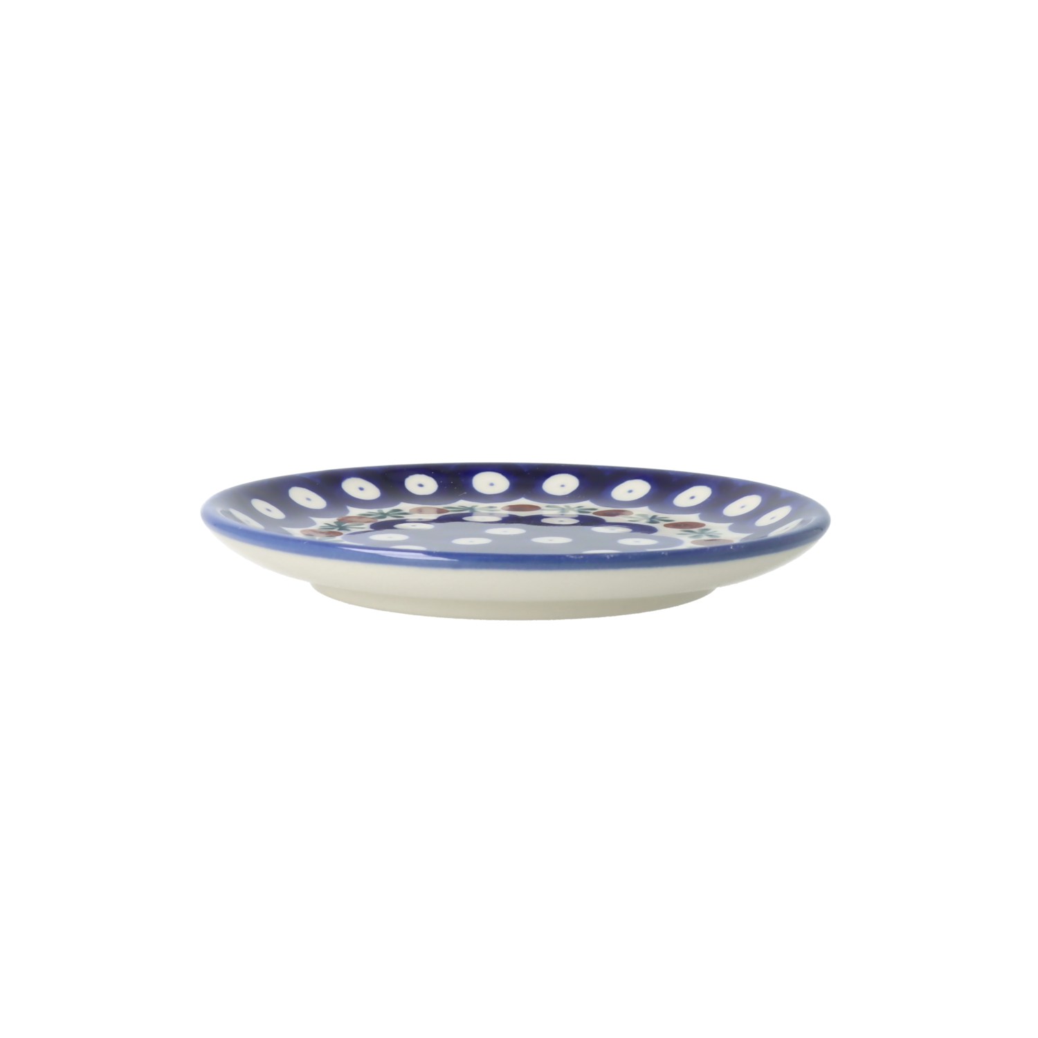 Mały talerzyk-spodek. Produkt ręcznie formowany i dekorowany w Ceramice Artystycznej S.R.A. Bolesławiec.
