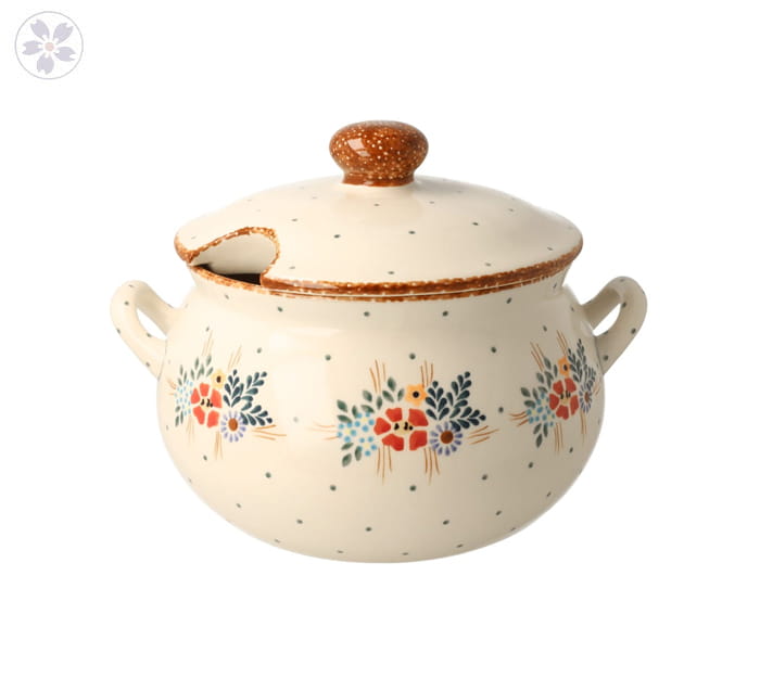 Waza z dwoma uchwytami i pokrywką, w której znajduje się otwór na łyżkę wazową. Odpowiednia do serwowania zup na rodzinnych obiadach oraz przyjęciach.