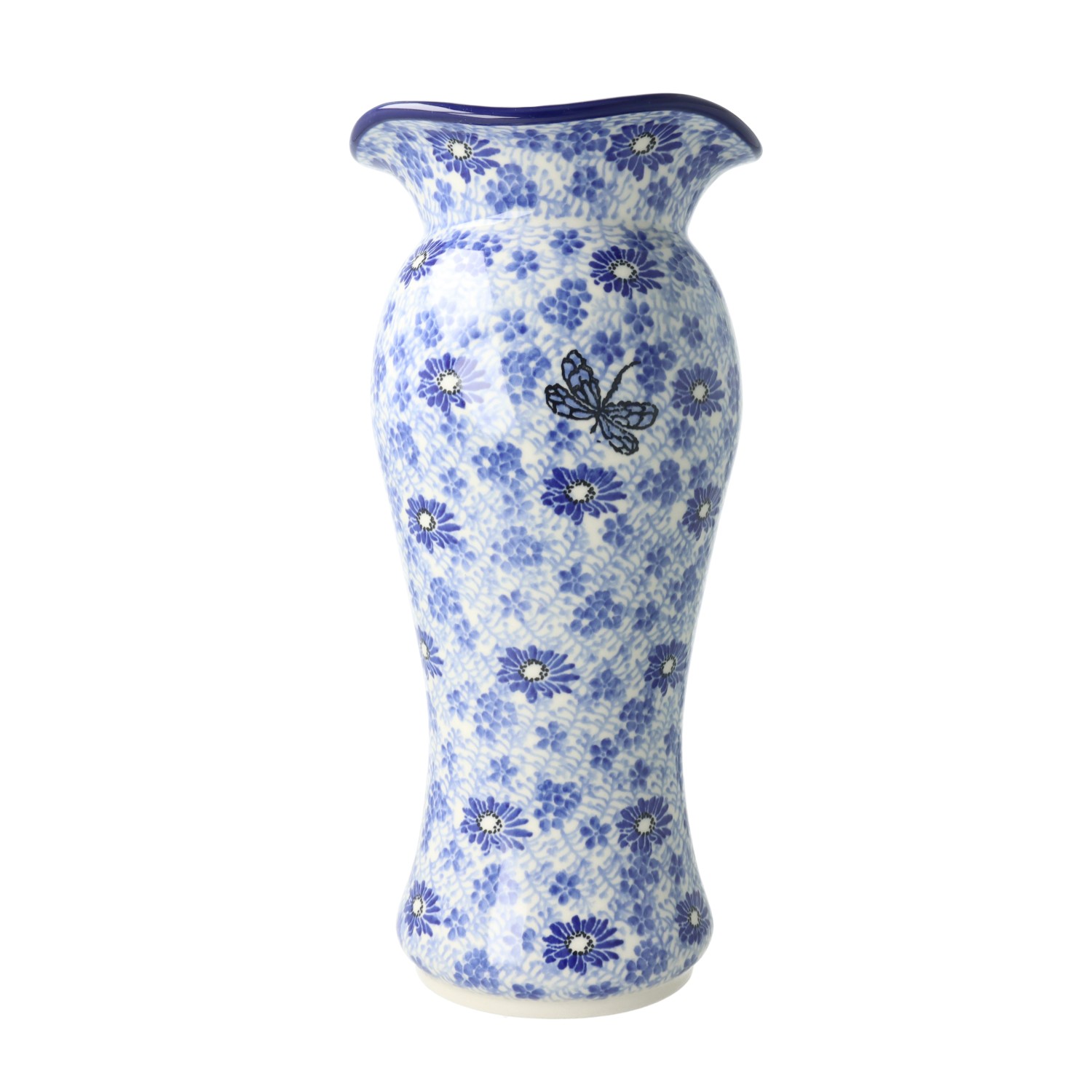 Pękaty wazon z rozszerzonym brzegiem. Produkt ręcznie formowany i dekorowany w Zakładach Ceramicznych Bolesławiec.