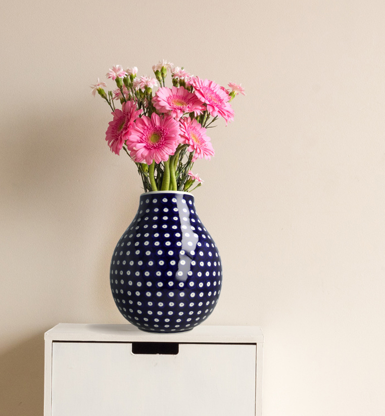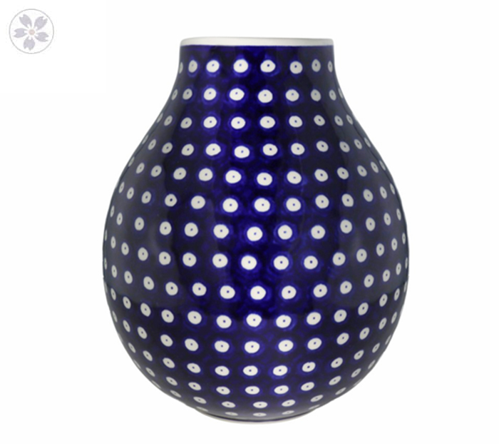 Duży, pękaty wazon na kwiaty z motywem kropek.