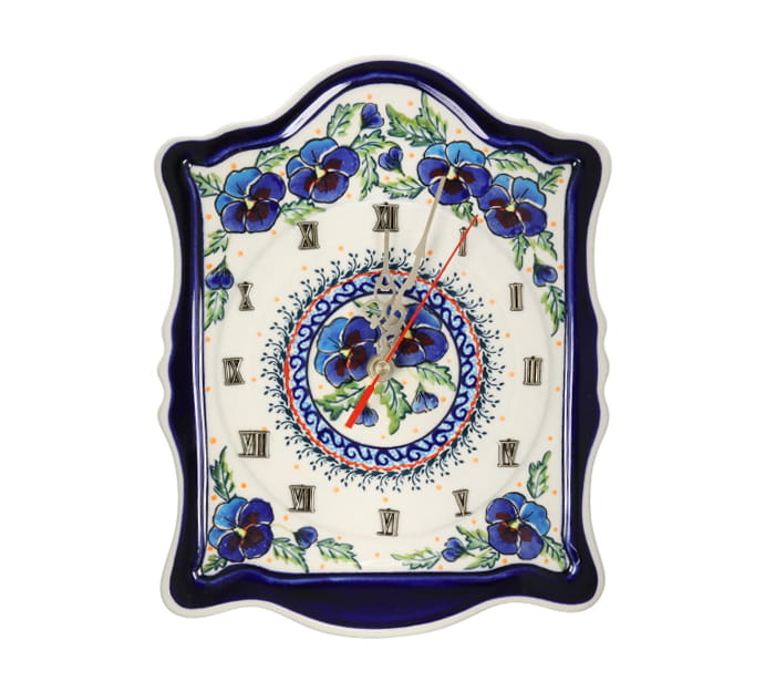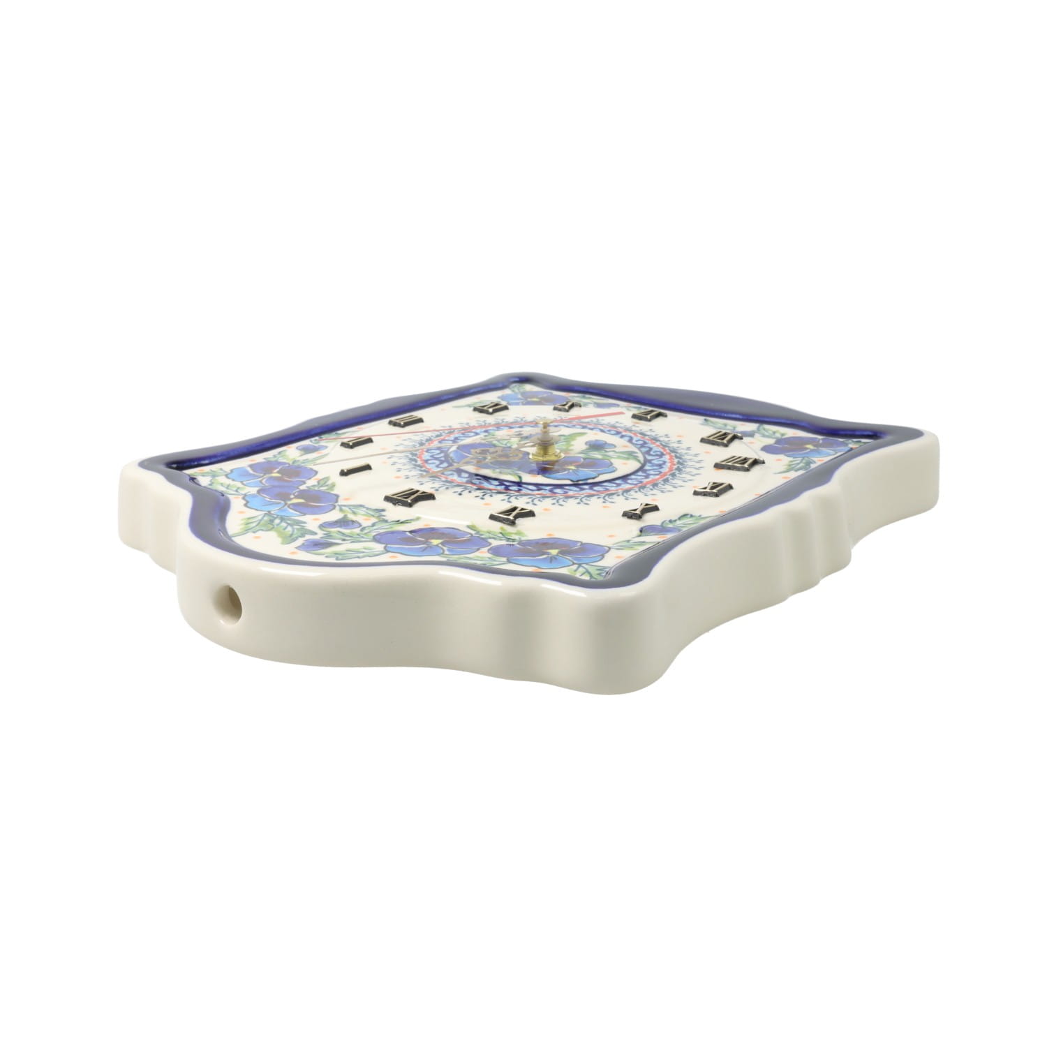 Prostokątny zegar, posiada bogato zdobioną, ceramiczną tarczę. Dzięki wcięciu w tylnej części można go łatwo powiesić na ścianie.