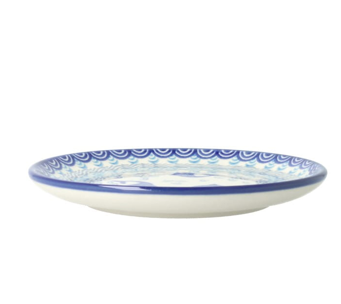 Płaski talerz deserowy. Produkt ręcznie formowany i dekorowany w Ceramice Artystycznej S.R.A. Bolesławiec.