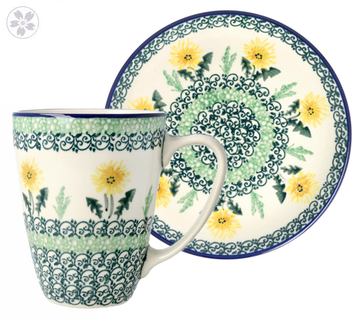 Zestaw składa się z kubka i talerza. Produkt ręcznie formowany i dekorowany w Zakładach Ceramicznych Bolesławiec.