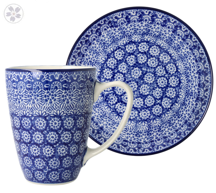 Zestaw składa się z kubka i talerza. Produkt ręcznie formowany i dekorowany w Zakładach Ceramicznych Bolesławiec.