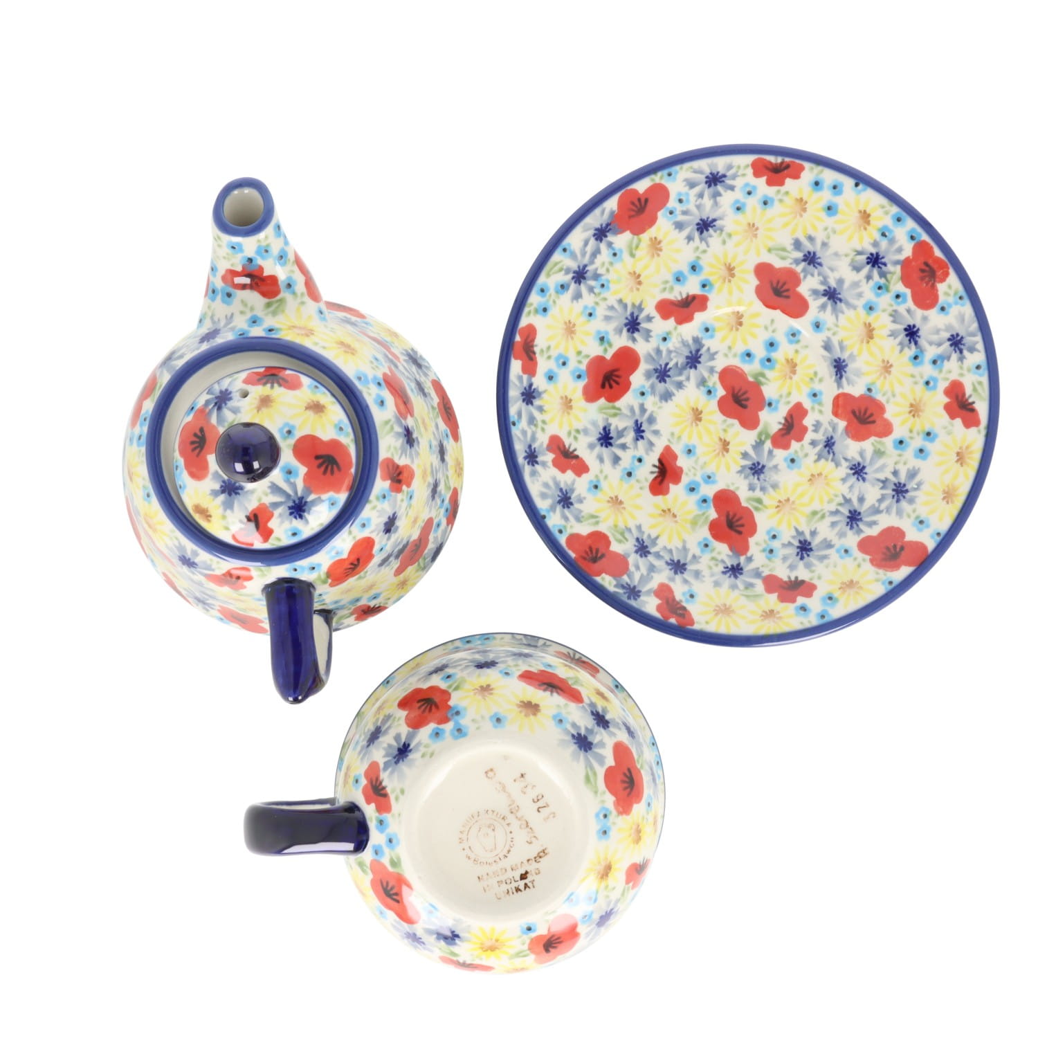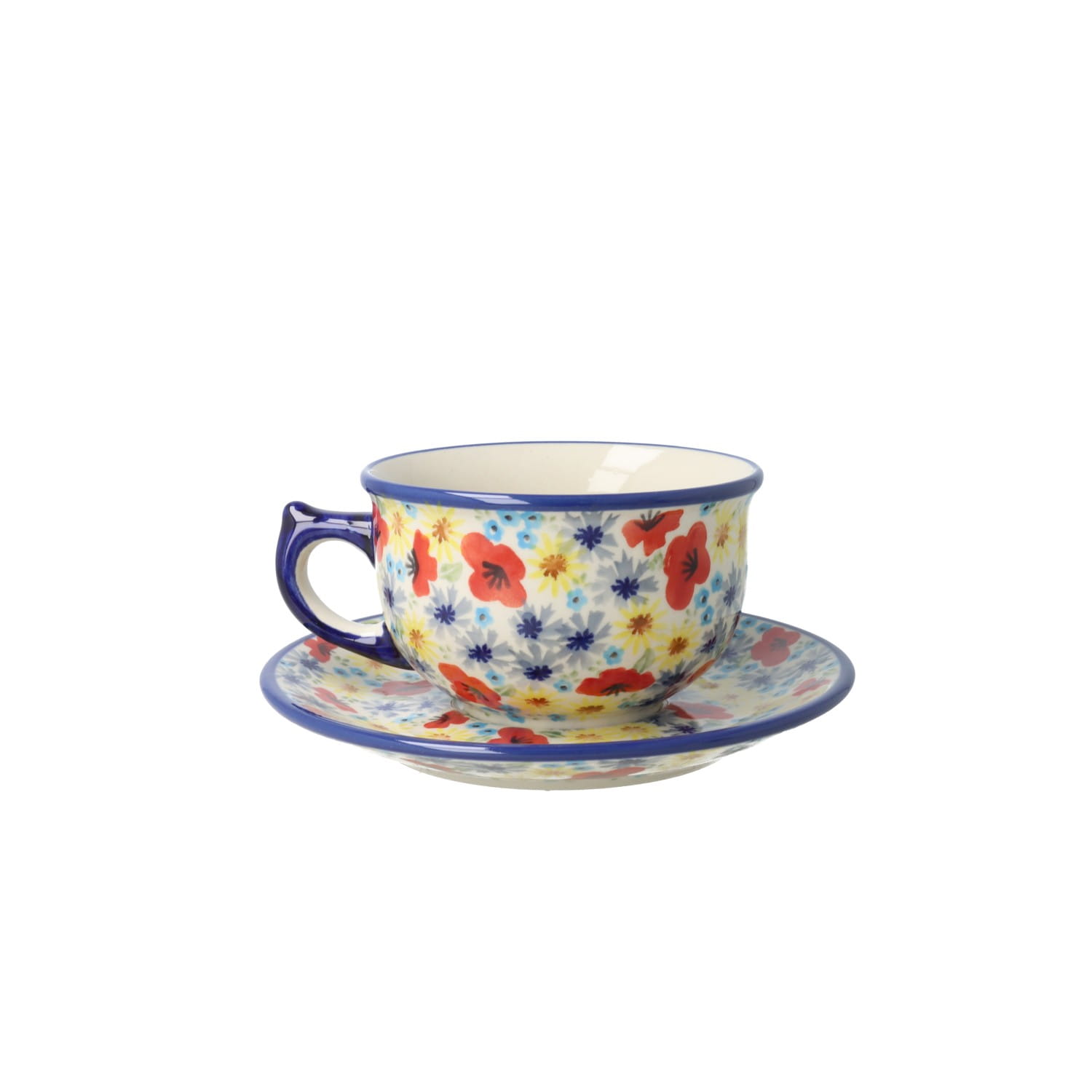 Zestaw filiżanka ze spodkiem i talerz. Produkt ręcznie formowany i dekorowany w Ceramice Artystycznej S.R.A. Bolesławiec.