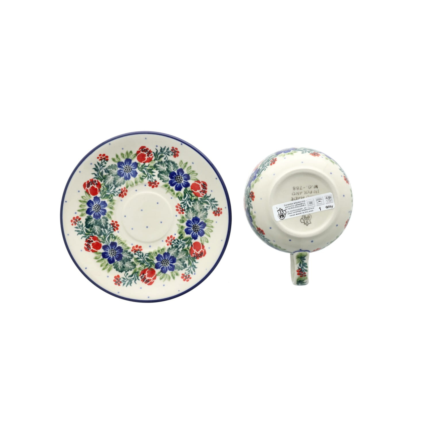 Filiżanka z profilowanym uchem oraz spodkiem. Produkt ręcznie formowany i dekorowany w Ceramice Artystycznej S.R.A. Bolesławiec.