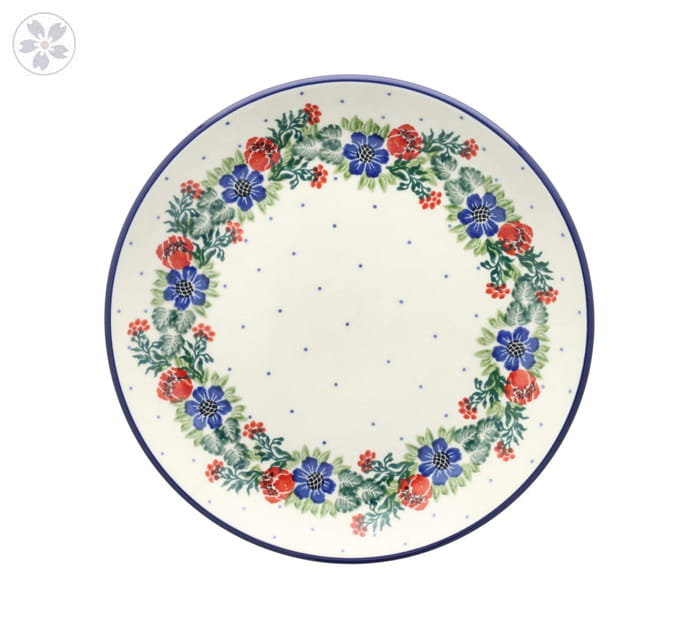Płaski talerz obiadowy. Produkt ręcznie formowany i dekorowany w Ceramice Artystycznej S.R.A. Bolesławiec.