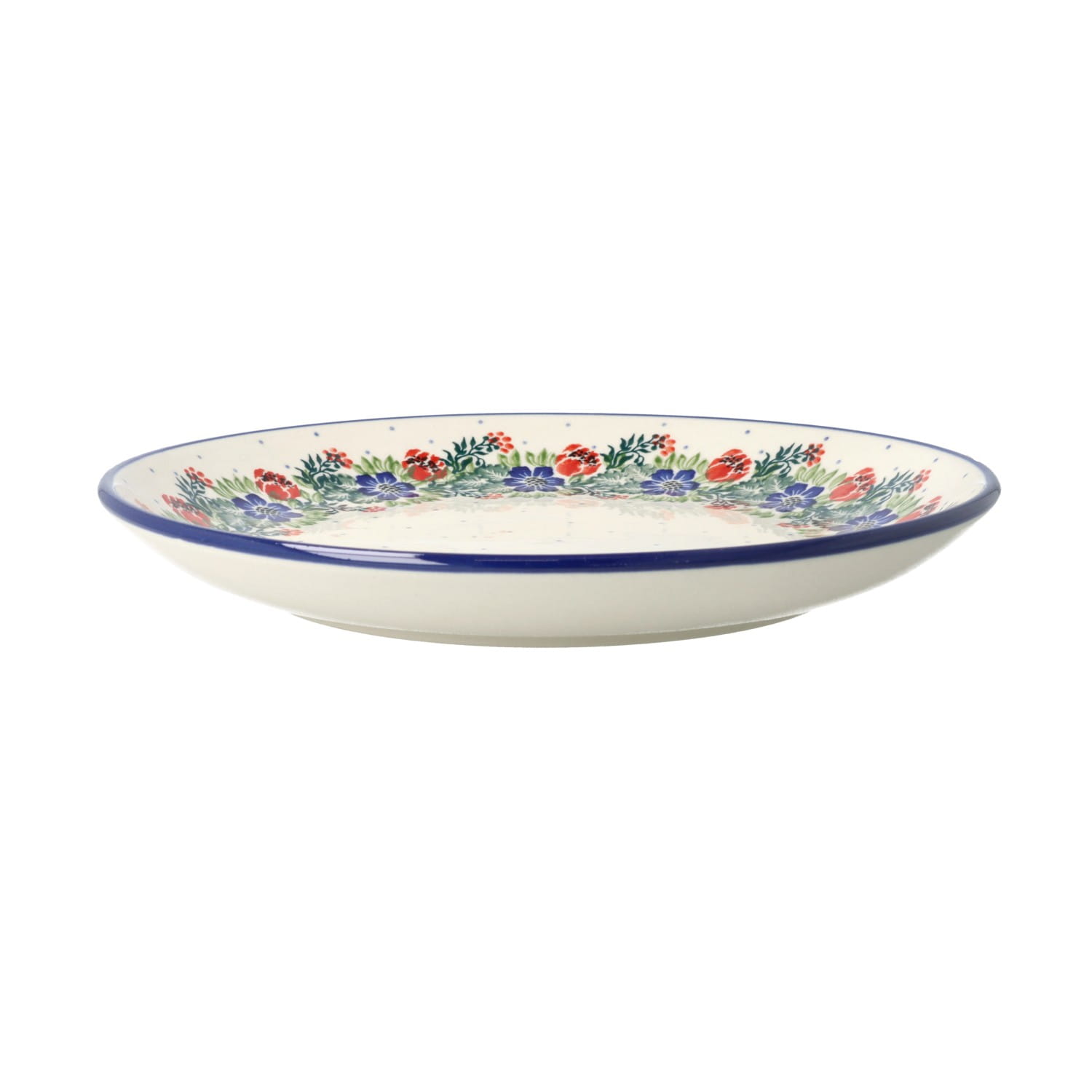 Płaski talerz deserowy. Produkt ręcznie formowany i dekorowany w Ceramice Artystycznej S.R.A. Bolesławiec.